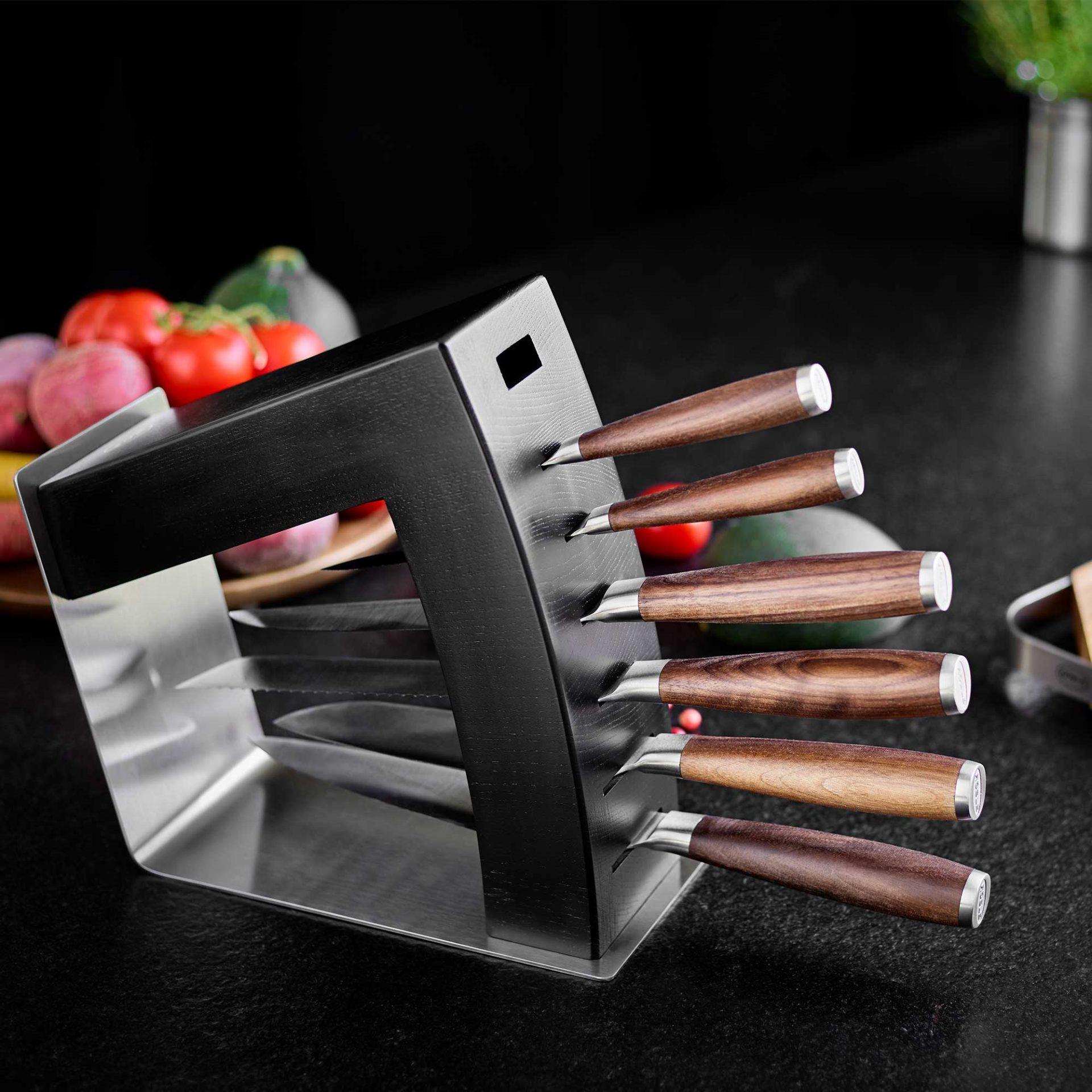 - Індивідуальна комплектація – місце для 6 ножів різних розмірів, включаючи відділення для ножиць: 2 великі слоти, наприклад, для кухарських ножів та ножів Сантоку (максимальна ширина: 50 мм)